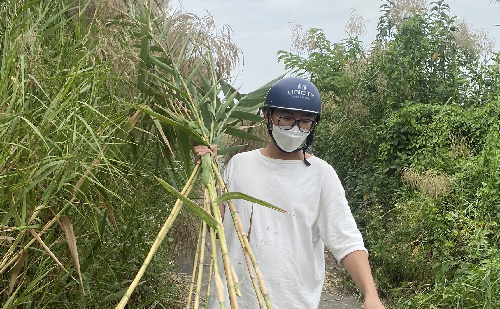Sau khi thu gom được cây cỏ sậy cả nhóm đã tiến hành khâu xử lý và vệ sinh. Cây cỏ sậy sau khi bỏ lá sẽ được chia thành từng đoạn, các ống cong được loại bỏ, chỉ giữ lại những ống thẳng.