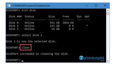 Bước 5: Gõ lệnh clean để tiến hành xóa sạch mọi thứ có trong đó, thao tác này tương đương với lệnh format.