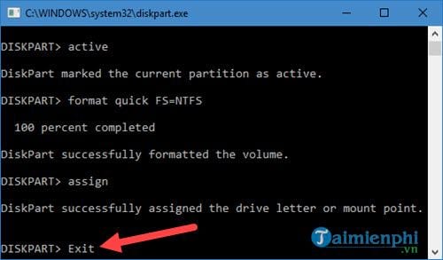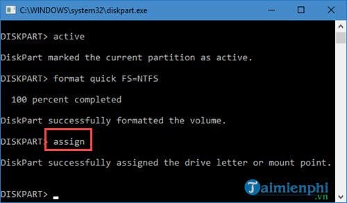 Bước 9: Sau khi hoàn tất việc format xong, hãy gõ tiếp assign. Đây là cú pháp giúp cho hệ thống tự đặt tên ổ cho phân vùng vừa rồi.