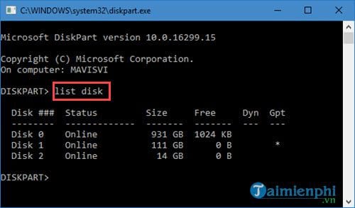 Bước 3: Tại đây bạn gõ tiếp lệnh list disk, lệnh này sẽ cho phép liệt kê toàn bộ phân vùng trong ổ cứng đó ra.
