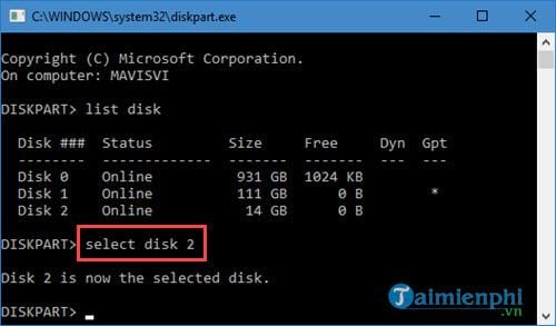 Bước 4: Tiếp theo là chúng ta lựa chọn phân vùng cần sửa lỗi không hiện Next khi cài Win 7, ở đây Taimienphi.vn ví dụ là disk số 2 nên sẽ gõ lệnh select disk 2.