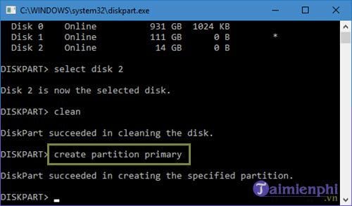 Bước 6: Bây giờ hãy tiến hành tạo lại cho phân vùng này bằng cách gõ lệnh create partition primary.