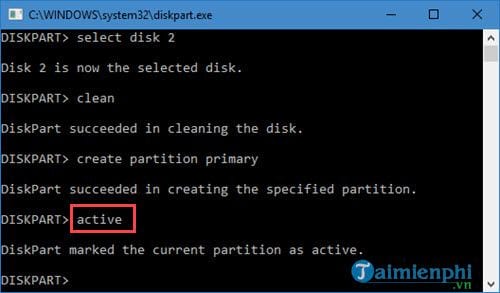 Bước 7: Gõ tiếp lệnh active, lệnh này cho phép phân vùng đó hoạt động ngay lập tức