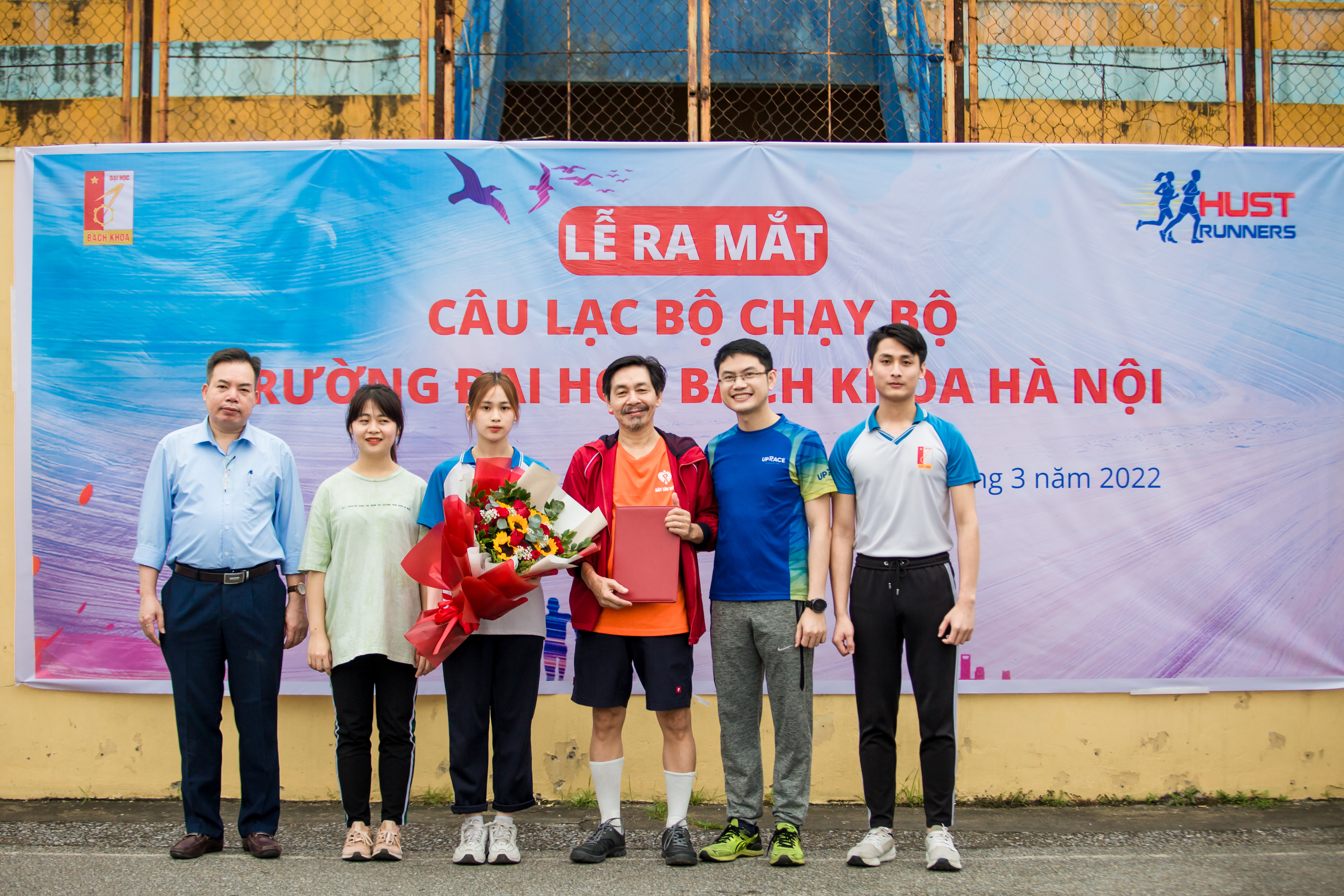 PGS. Nguyễn Tiến Dũng (ngoài cùng bên trái) – Phó CT Hội thể thao Bách khoa Hà Nội - đơn vị bảo trợ HUST Runners Club – trao quyết định thành lập CLB cho ban chủ nhiệm.