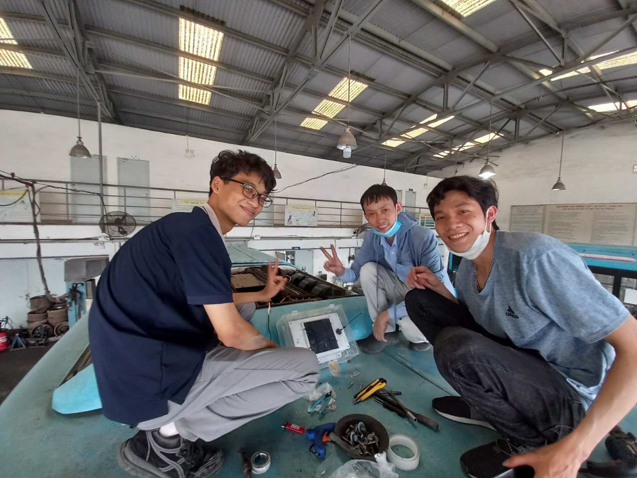 Sinh viên Bách khoa lắp đặt thiết bị Fi-Mi trên nóc xe buýt dưới sự hướng dẫn của PGS. Đỗ Phan Thuận (người đeo khẩu trang xanh)