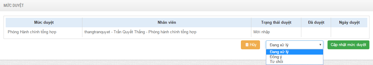 Tiến hành chọn mức duyệt “Đang xử lý”, “Đồng ý” hoặc “Từ chối” thông tin yêu cầu. Hoặc nhấp nút