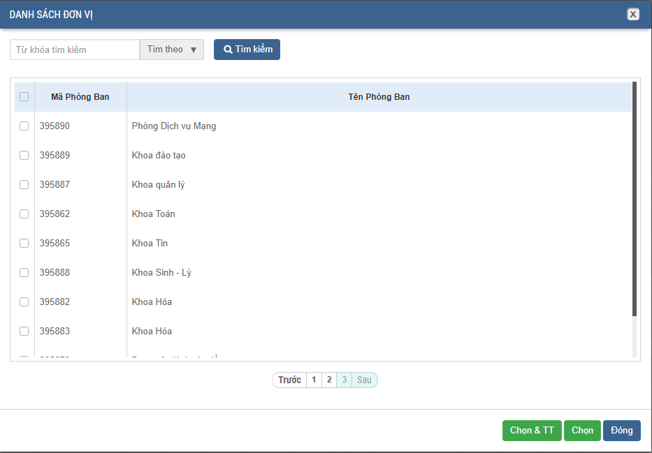 , danh sách các đơn vị trong trường sẽ hiển thị lên, người dùng cũng có thể tìm theo mã hoặc tên phòng ban