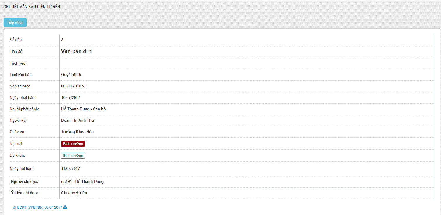 - Sau khi văn bản được tiếp nhận thì trong lịch sử văn bản sẽ hiển thị nội dung người tiếp nhận, ngày tiếp nhận văn bản:
