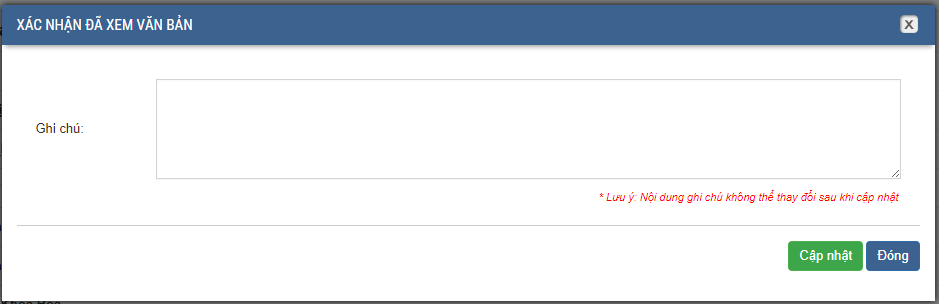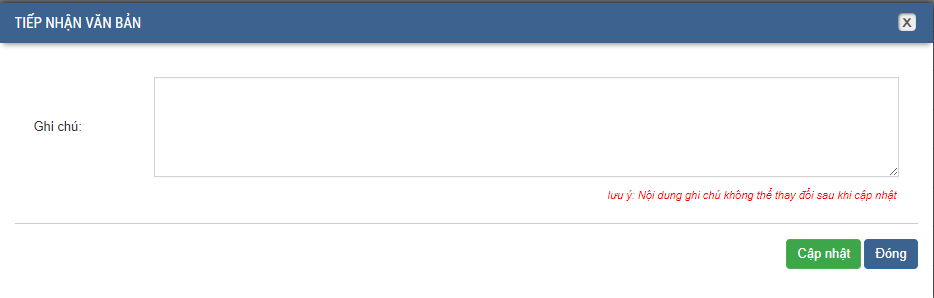 - Màn hình popup tiếp nhận văn bản sẽ hiển thị: Có thể nhập thông tin ghi chú (nếu có) à ấn nút “Cập nhật”