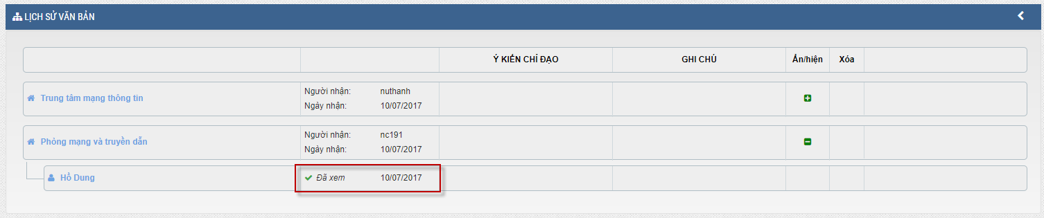 Sau khi cập nhật thành công, trong lịch sử văn bản sẽ hiển thị “đã xem”: