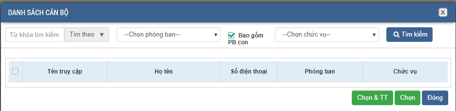 , người dùng có thể tìm kiếm bằng cách nhập tên hoặc mã, hoặc tìm theo phòng ban, chức vụ.