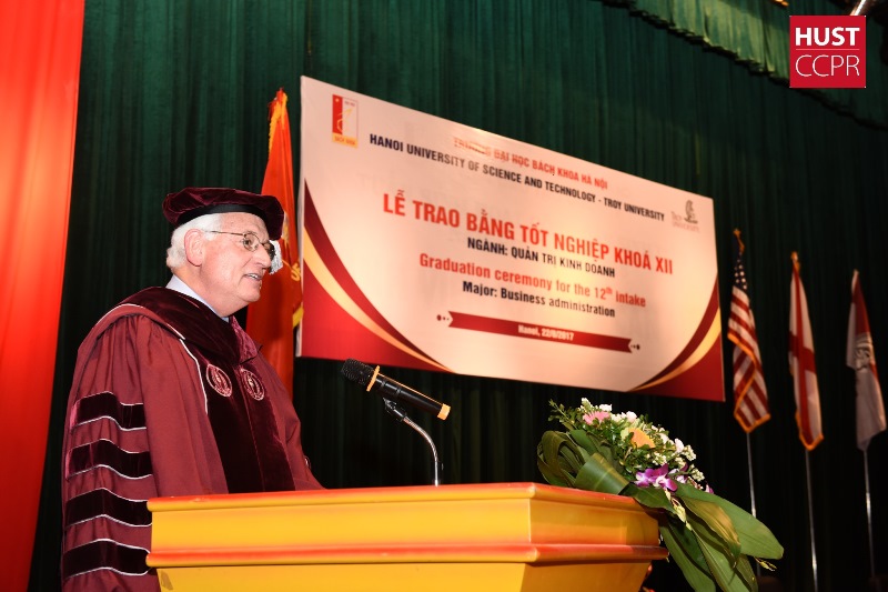 Chúc mừng và trao bằng cho các tân cử nhân, TS Jack Hawkins khẳng định: “Trong giai đoạn hiện nay, với việc tốt nghiệp ĐH Troy, các tân cử nhân đã trang bị cho mình “lợi thế cạnh tranh” mang tính quốc tế từ uy tín học thuật của ĐH Troy và từ chính ngôi trường các em đang học nơi đây – ĐHBK Hà Nội, một trong những trường đại học uy tín nhất Việt Nam. Một lần nữa, chúc mừng các em đã gia nhập đội ngũ 150.000 cựu sinh viên ĐH Troy trên toàn thế giới nhân dịp ĐH Troy tròn 130 tuổi. Chúng tôi tự hào về các em!”.