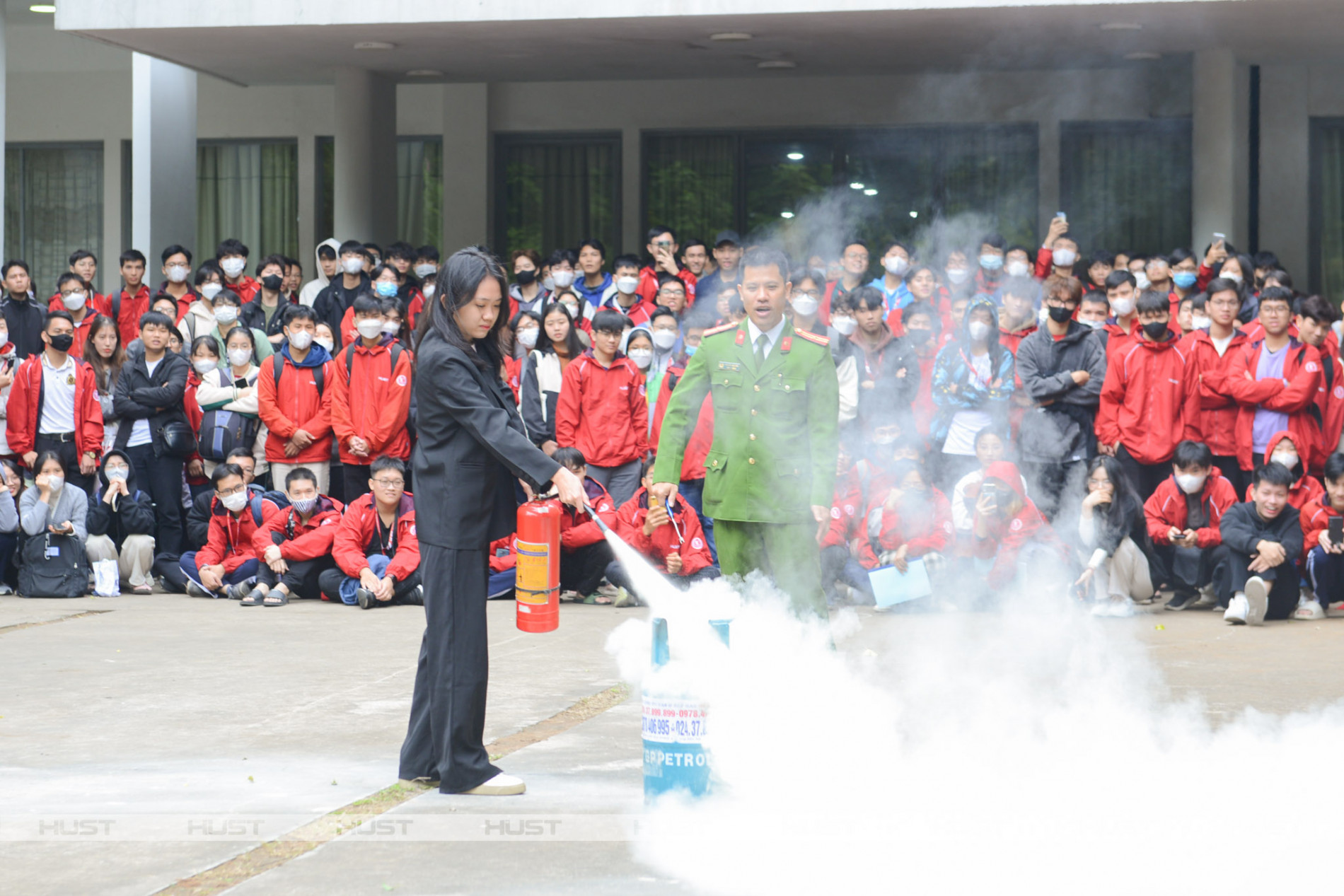 Sau những giờ chia sẻ kiến thức về PCCC, cứu nạn cứu hộ, sinh viên Bách khoa Hà Nội được tham gia thực hành, diễn tập và sử dụng bình cứu hỏa an toàn và đúng kỹ thuật.