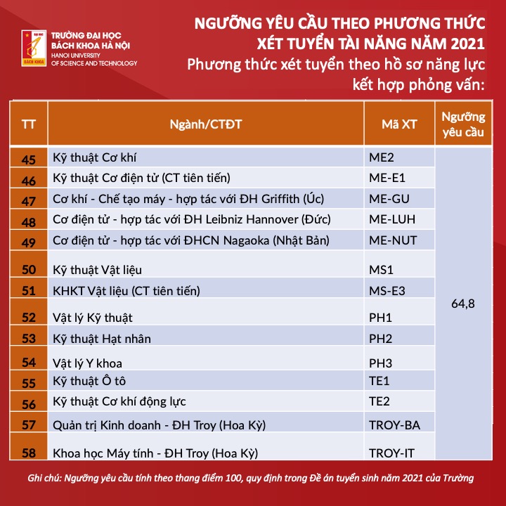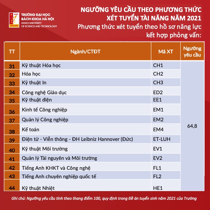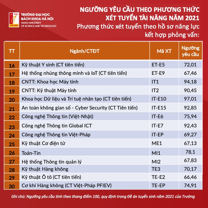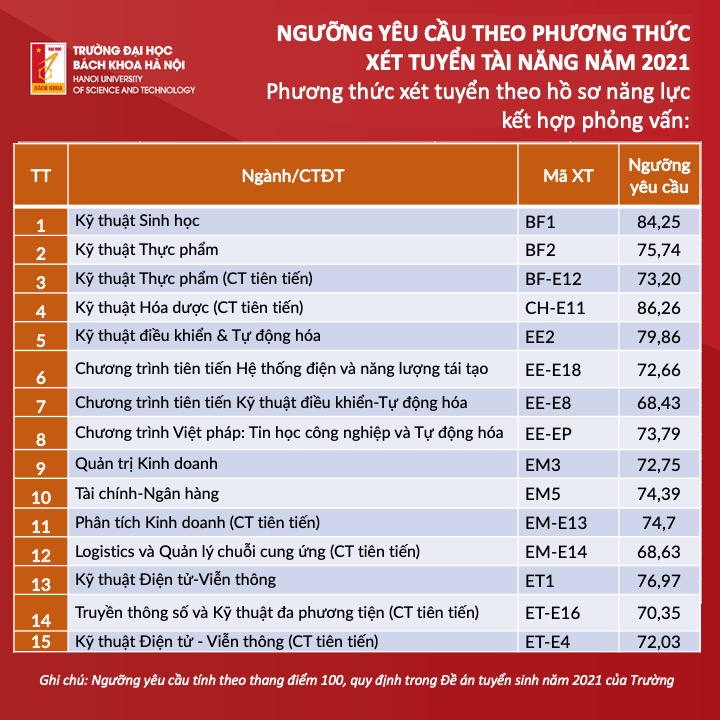 Hội đồng tuyển sinh, Trường Đại học Bách khoa Hà Nội trân trọng thông báo ngưỡng yêu cầu đối với các thí sinh đăng ký xét tuyển vào các ngành/chương trình đào tạo đại học chính quy của Trường năm 2021 theo phương thức Xét tuyển tài năng đợt 1 như sau:
