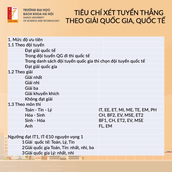 Hội đồng tuyển sinh, Trường Đại học Bách khoa Hà Nội trân trọng thông báo ngưỡng yêu cầu đối với các thí sinh đăng ký xét tuyển vào các ngành/chương trình đào tạo đại học chính quy của Trường năm 2022 theo phương thức Xét tuyển tài năng đợt 1 như sau: