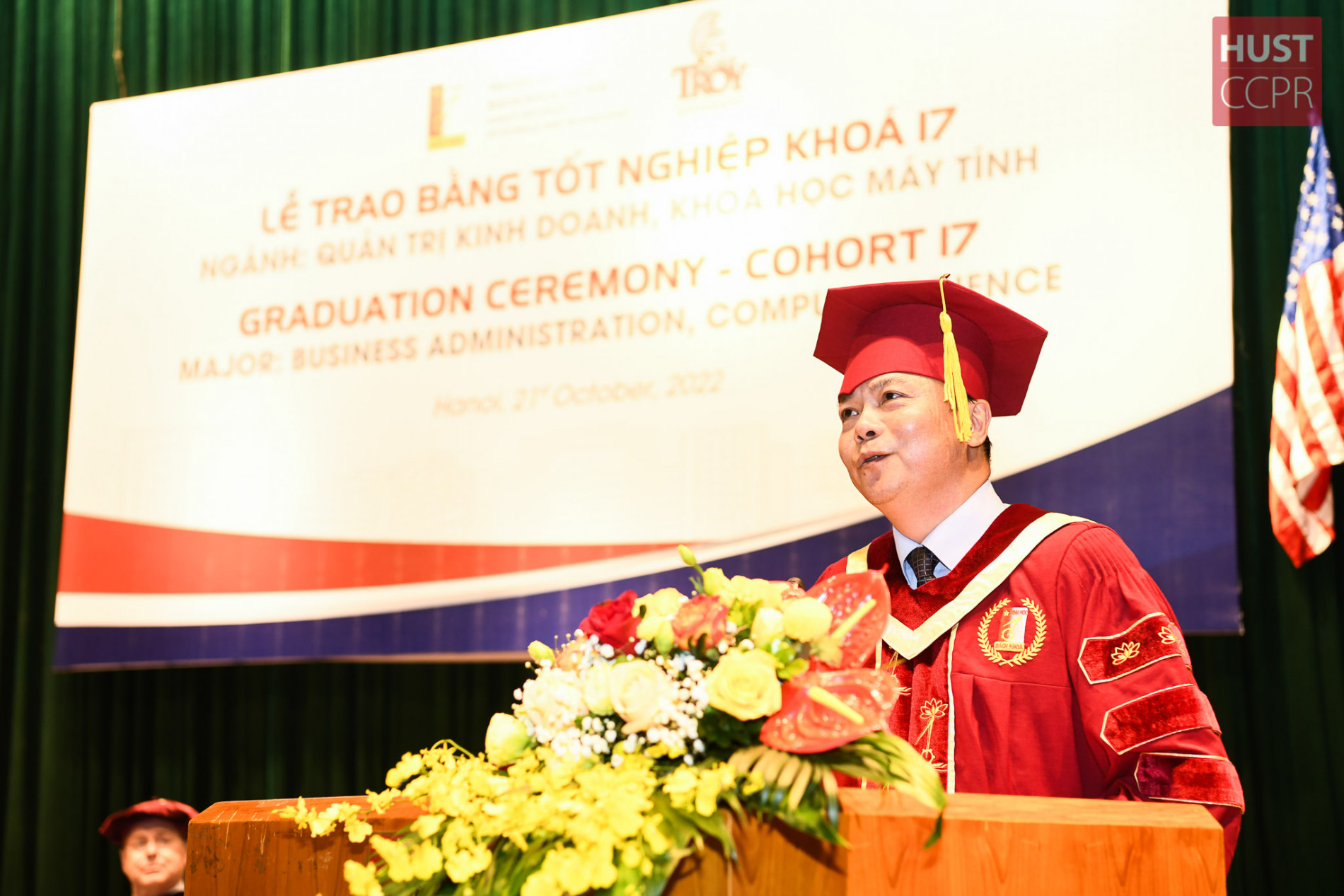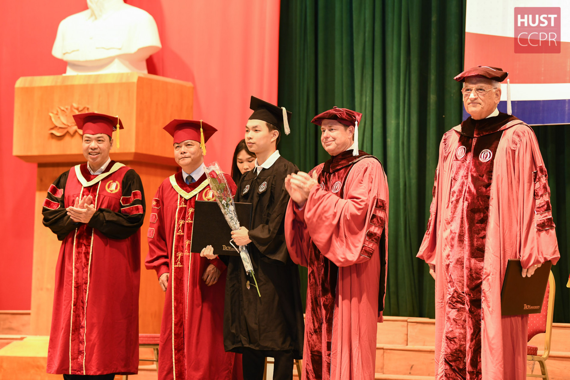 Lãnh đạo Bách khoa Hà Nội và Đại học Troy trao bằng, tặng hoa cho các tân cử nhân tại buổi lễ tốt nghiệp ngày 21/10. Ảnh: Duy Thành