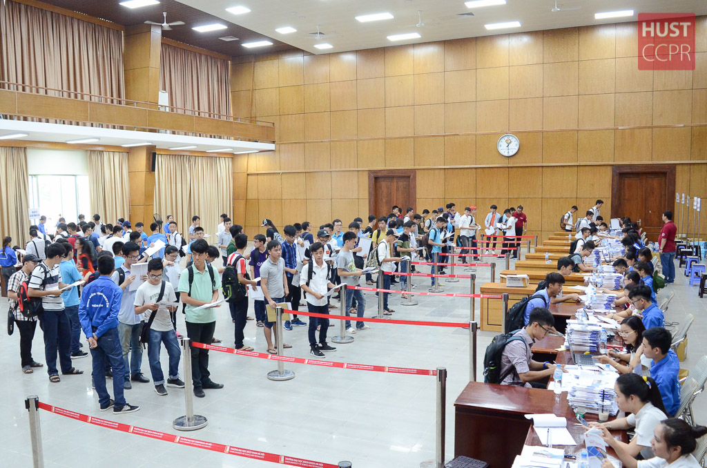 Nhằm tạo điều kiện thuận lợi cho các tân sinh viên nhập học, Trường ĐHBK Hà Nội đã xây dựng kết hoạch, bố trí hội trường rộng rãi để tiếp đón và tạo điều kiện cho các em có thể làm thủ tục nhanh chóng, đơn giản nhất. Năm nay, Trường cho các em đăng ký nhập học trực tuyến qua cổng thông tin đào tạo của Trường, giúp các em chuẩn bị tốt hồ sơ nhập học, tránh tình trạng xếp hàng chờ đợi lâu. Đối với những em chưa kịp đăng ký trực tuyến, Trường cũng hỗ trợ tối đa giúp các em hoàn thiện hồ sơ.