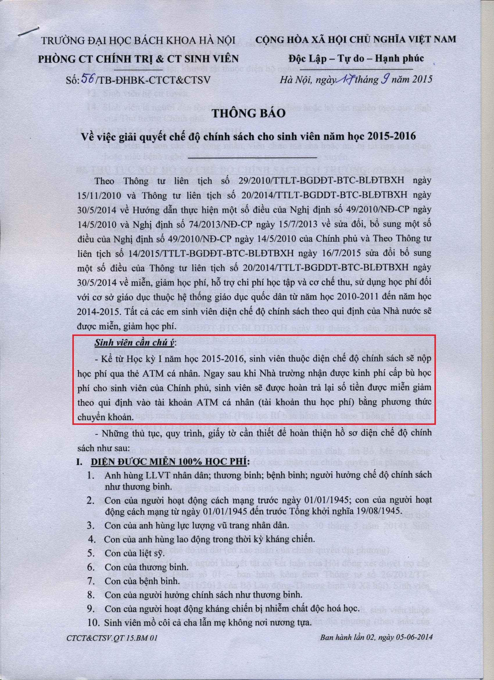 1. Thông báo về việc giải quyết chế độ chính sách cho sinh viên năm học 2015 - 2016