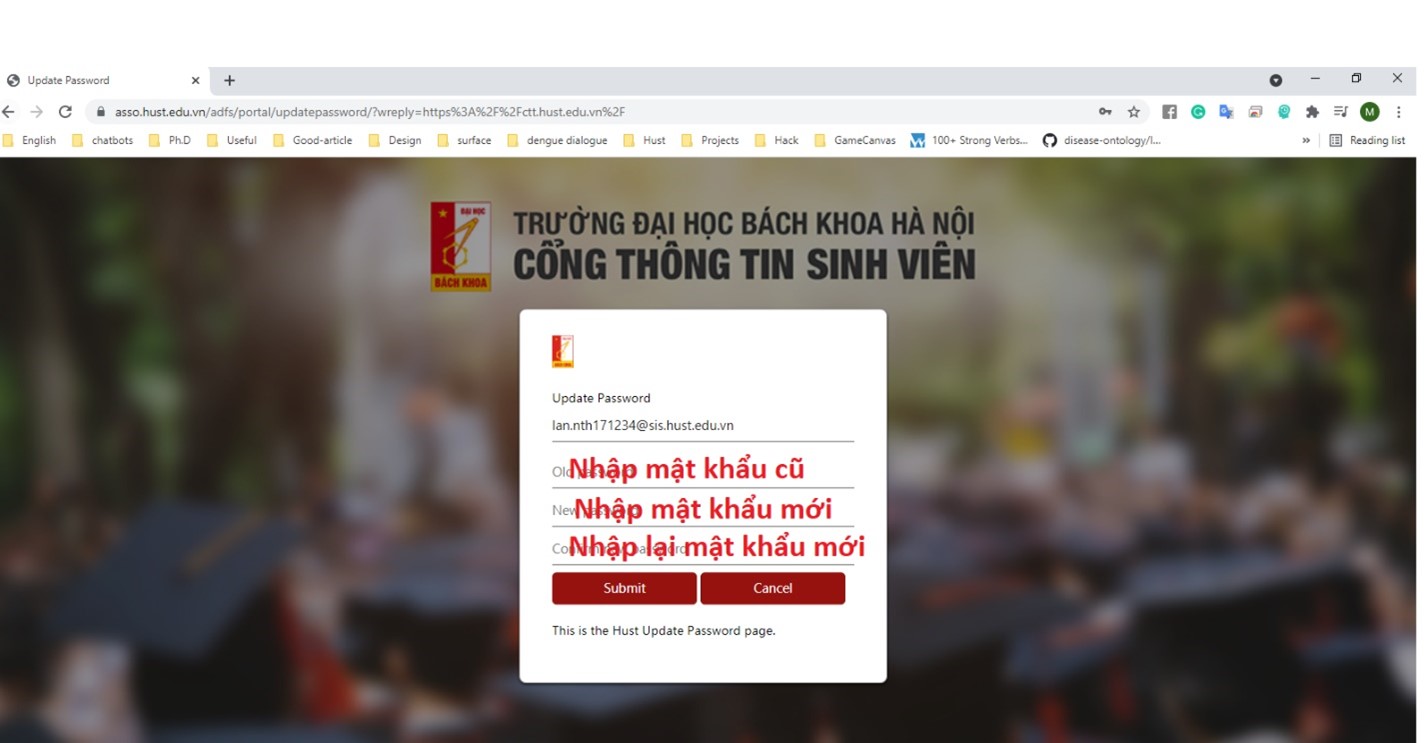 Bước 3: Điền thông tin vào form đổi mật khẩu bao gồm