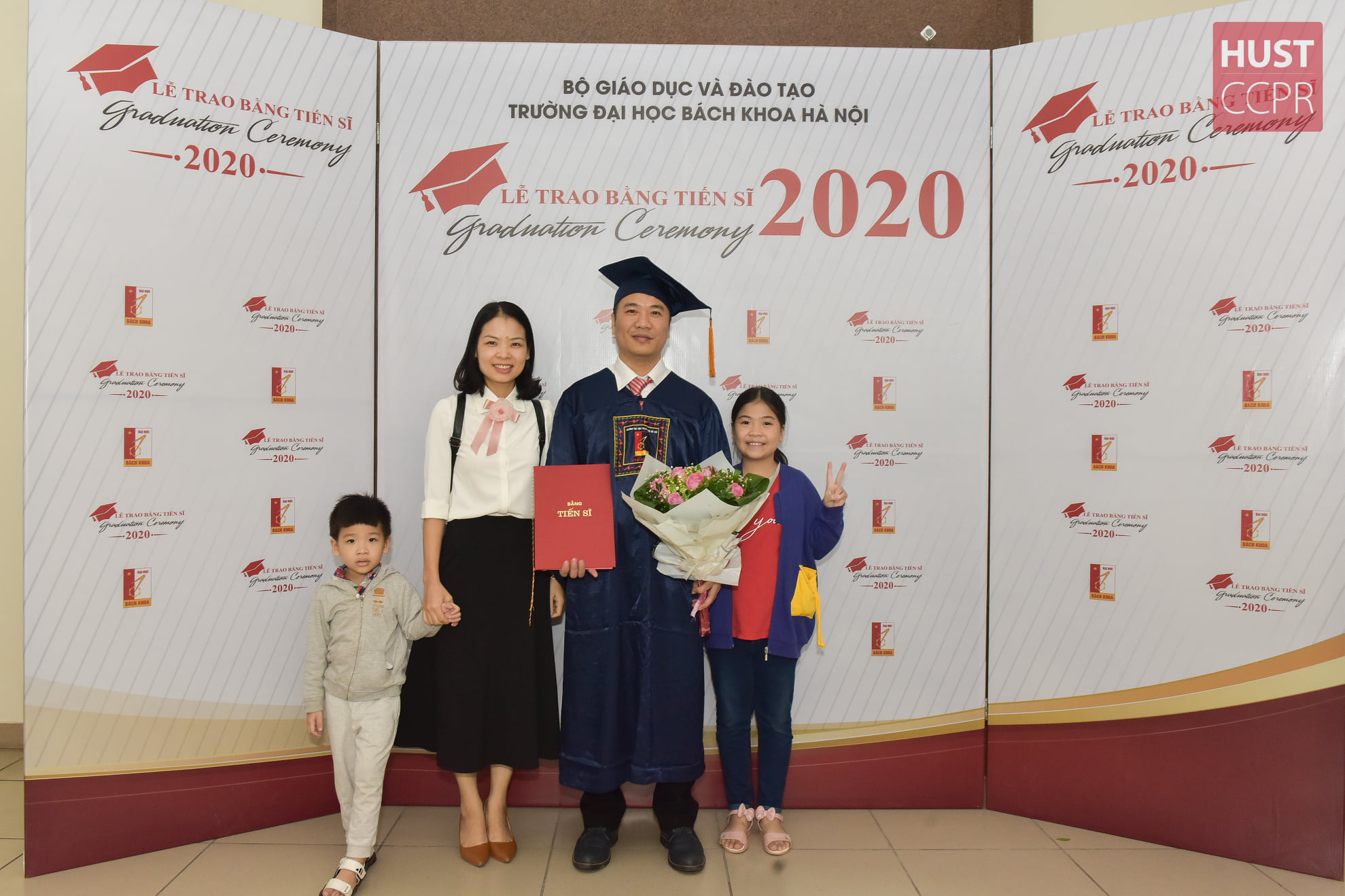 Tiến sĩ Nguyễn Ngọc Minh chụp ảnh kỷ niệm cùng vợ và hai con tại buổi lễ trao bằng ngày 14/10 ở Trường Đại học Bách khoa Hà Nội. Ảnh: CCPR-Kim Chi.