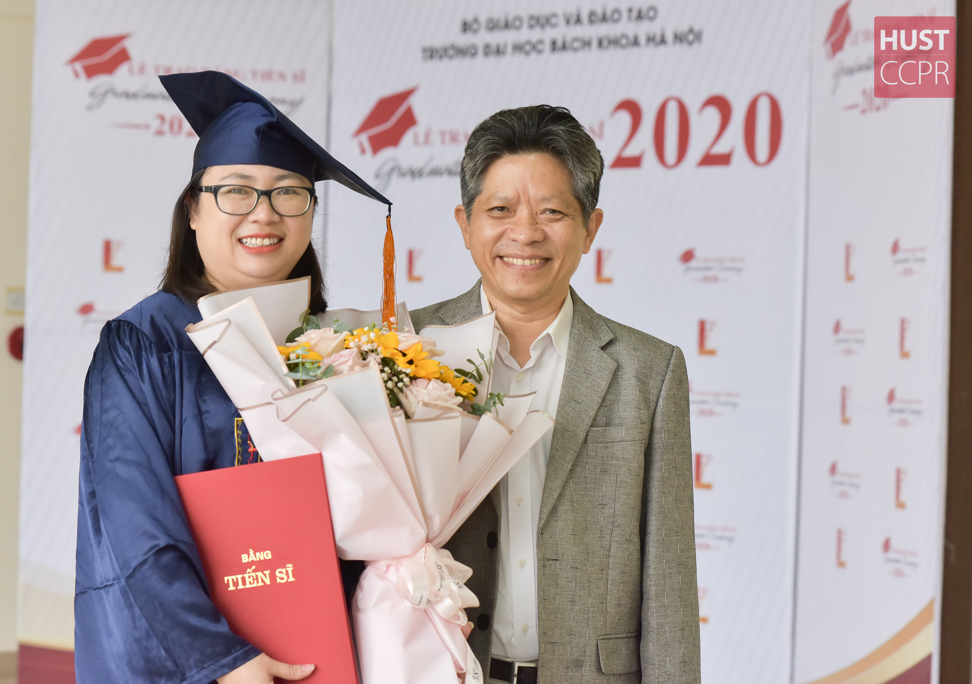 Tiến sĩ Nguyễn Thị Thu Thủy và thầy hướng dẫn PGS. Nghiêm Trung Dũng bên lề buổi lễ trao bằng ngày 14/10 tại Trường Đại học Bách khoa Hà Nội. Ảnh: CCPR-Kim Chi.