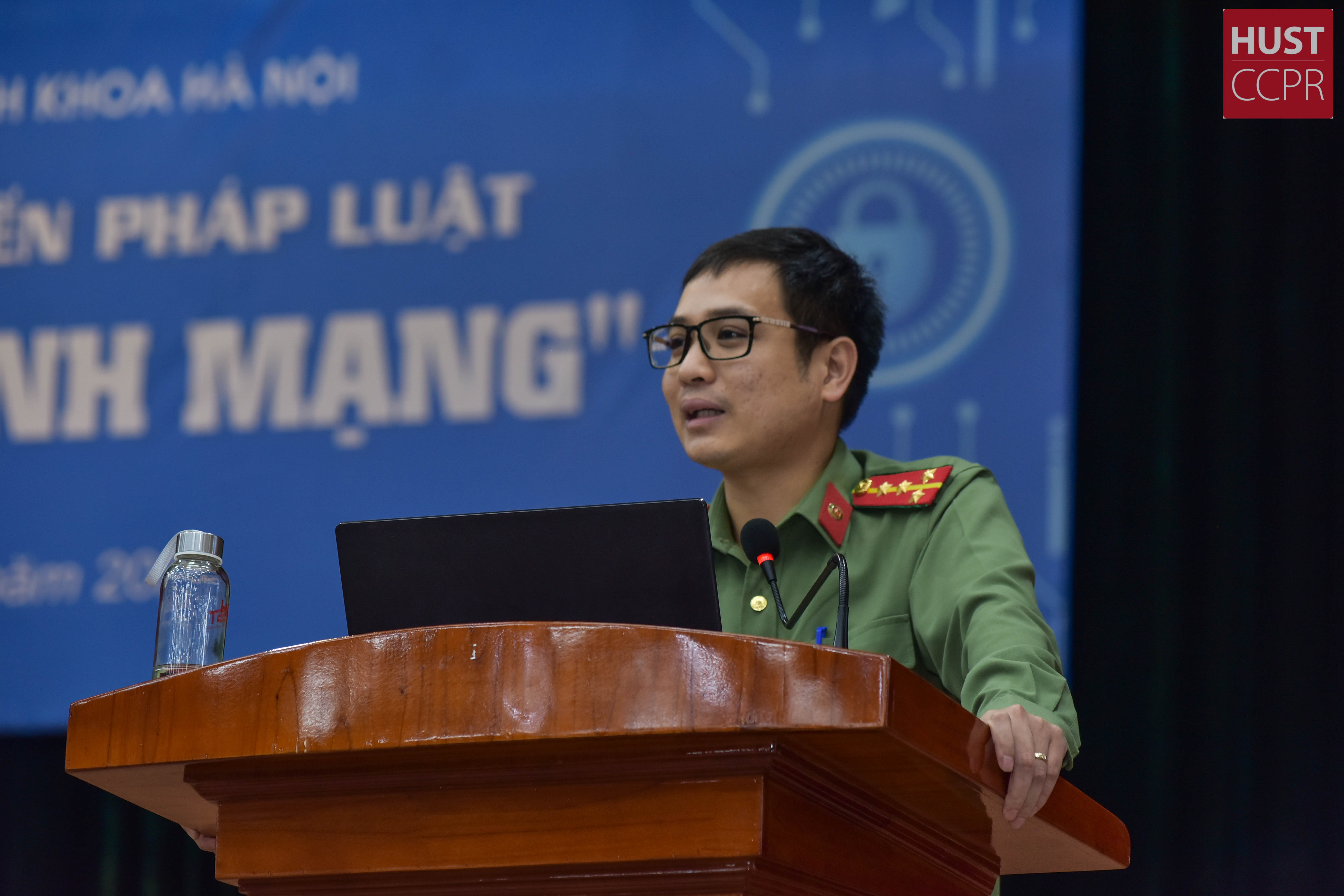 Giới thiệu đến sinh viên Bách khoa Hà Nội về các điều luật của Luật An ninh mạng, Đại úy Nguyễn Đăng Hiển - Phó Đội trưởng Phòng An ninh Chính trị nội bộ Công an TP. Hà Nội - đưa ra những câu chuyện thực tế về những hệ quả gây ra bởi không gian mạng mà đối tượng ở đây chủ yếu là các bạn trẻ, các bạn sinh viên.