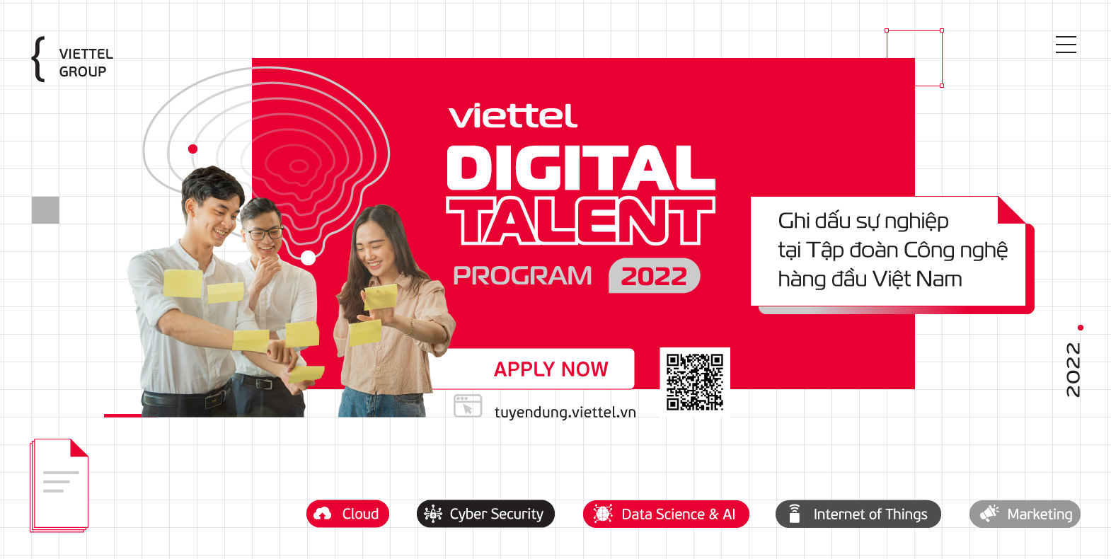 Viettel Digital Talent –Thực tập sinh Tài năng là chương trình được thiết kế bởi các chuyên gia hàng đầu Viettel giúp các tài năng trẻ khai phá tiềm năng và phát triển chuyên môn trong các lĩnh vực Cloud, Cyber Security, Data Science & AI, Internet of Things, Marketing. Triển khai trong 2 giai đoạn xuyên suốt 6 tháng, chương trình hứa hẹn mang lại nhiều kiến thức và trải nghiệm thực tế cho sinh viên: