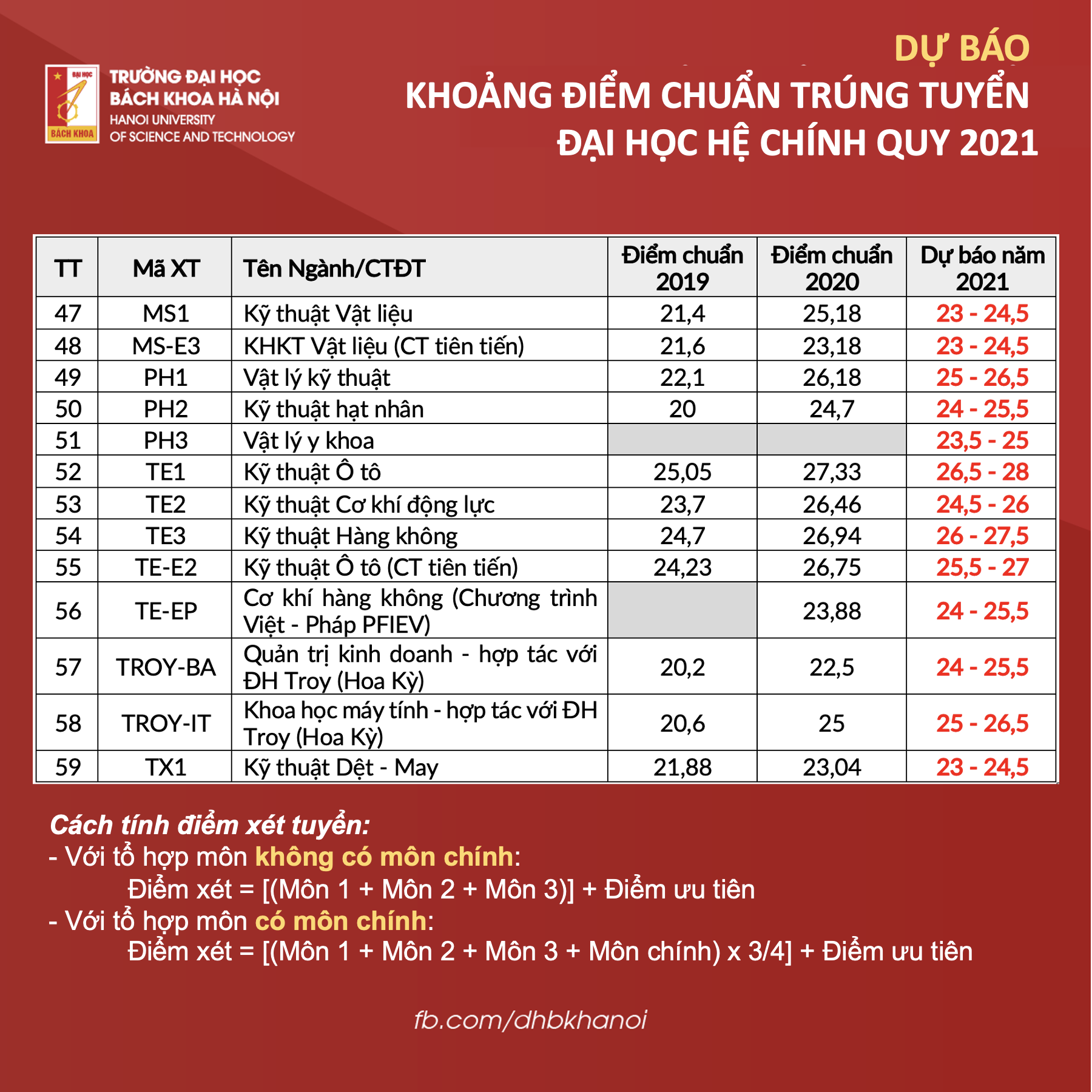 Ngày 22/8/2021, Đại học Bách khoa Hà Nội đã đưa ra dự báo khoảng điểm chuẩn xét tuyển vào các ngành, chương trình đào tạo đại học chính quy của Trường năm 2021 theo điểm thi tốt nghiệp THPT là từ 23 điểm.Khoa học máy tính IT1 vẫn được dự báo mức điểm có thể lên tới 27,5 – 29 điểm.