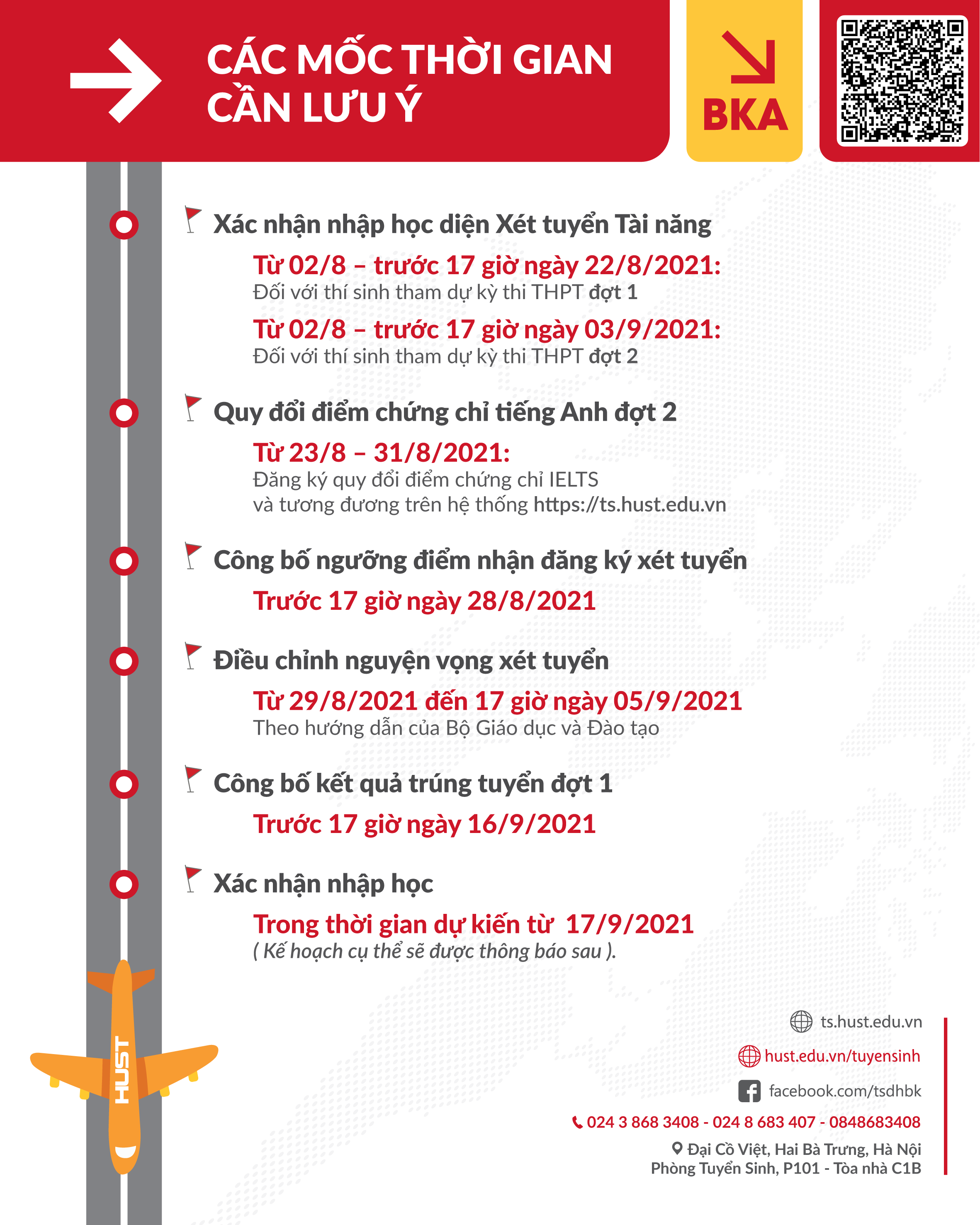 Mốc thời gian thí sinh cần lưu ý Từ 02/8/2021 đến trước 17 giờ ngày 22/8/2021 (đối với thí sinh tham dự kỳ thi THPT đợt 1) và trước 17 giờ ngày 03/9/2021 (đối với thí sinh tham dự kỳ thi THPT đợt 2): Thí sinh đủ điều kiện trúng tuyển theo phương thức xét tuyển tài năng làm thủ tục xác nhận nhập học Từ 23/8/2021 đến 31/8/2021: Nhà trường sẽ mở đăng ký quy đổi điểm chứng chỉ tiếng Anh đợt 2. Trước 17 giờ ngày 28/8/2021: Công bố thông tin về ngưỡng điểm nhận đăng ký xét tuyển. Từ 29/8/2021 đến 17 giờ ngày 05/9/2021: Thí sinh thực hiện điều chỉnh nguyện vọng xét tuyển theo hướng dẫn của Bộ Giáo dục và Đào tạo. Trước 17 giờ ngày 16/9/2021: Công bố kết quả trúng tuyển đợt 1. Dự kiến từ 17/9/2021: Thí sinh làm thủ tục xác nhận nhập học (kế hoạch cụ thể sẽ được thông báo sau). |