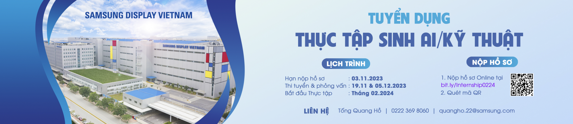 Ban Hợp tác đối ngoại trân trọng thông báo Chương trình thực tập sinh Kỹ thuật và Chương trình thực tập sinh AI kỳ 2023.2 (tháng 2.2024) của Công ty Samsung Display Việt Nam (SDV), tại Khu Công nghiệp Yên Phong, xã Yên Trung, huyện Yên Phong, tỉnh Bắc Ninh.