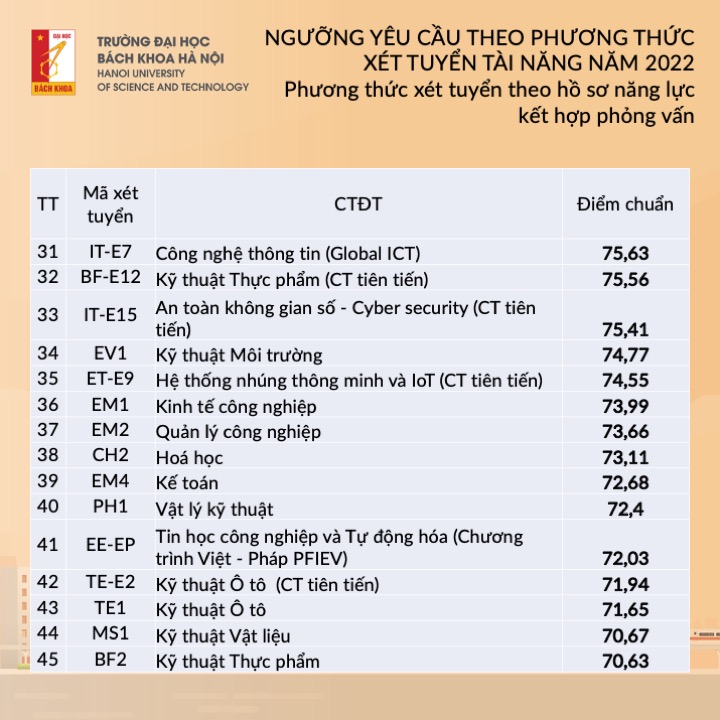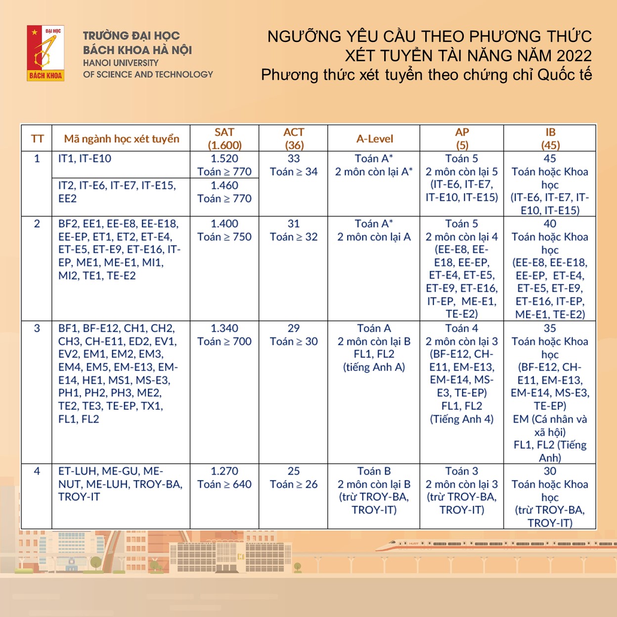 Hội đồng tuyển sinh, Trường Đại học Bách khoa Hà Nội trân trọng thông báo ngưỡng yêu cầu đối với các thí sinh đăng ký xét tuyển vào các ngành/chương trình đào tạo đại học chính quy của Trường năm 2022 theo phương thức Xét tuyển tài năng đợt 1 như sau: